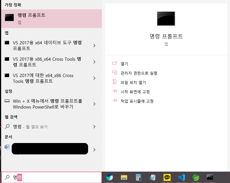 윈도우 검색창에 명령프롬포트 입력 후 열면 됨