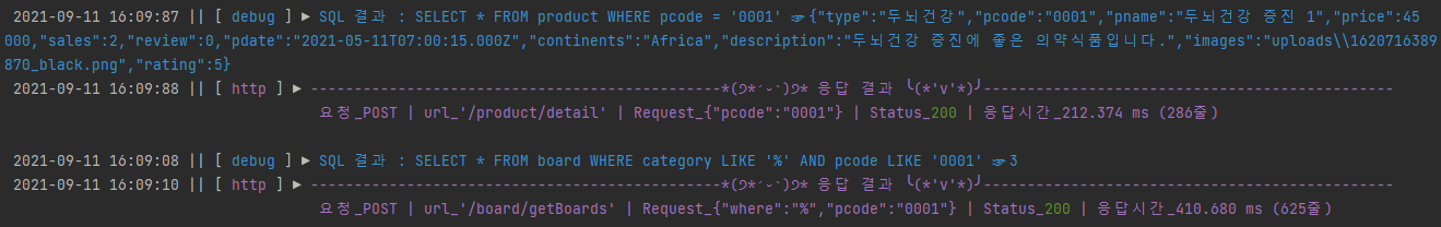 SQL 결과 찍히는 것도 따로 함수를 만들어놔서 이쁘게 출력되는 중이다 ㅋㅋㅋ 암튼 이렇게 눈으로 보면서 개발할 수 있으니 좀 더 편하게 디버깅도 할 수 있었다.