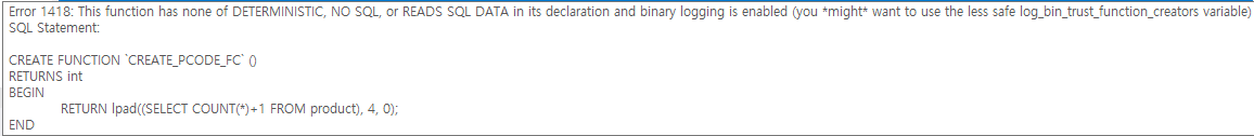 [mySQL] mySQL function 생성 시 1418에러 / ERROR 1418: This function has none of DETERMINISTIC, NO SQL, or READS SQL DATA in its declaration and binary logging is enabled (you *might* want to use the less safe log_bin_trust_function_creators variable)