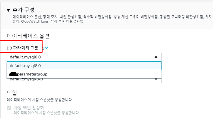 그리고 하단쪽에 추가구성에가면 파라미터그룹을 설정할 수 있다.